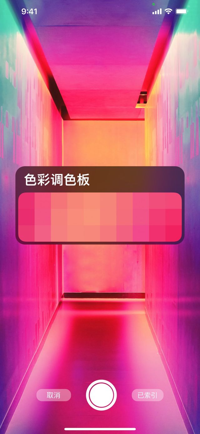 轻点面板上方 新建调色板 > 从“相机“新建 按钮,此时你会看到摄像头对准的画面中央出现满是色卡的调色板,在此调色板的右边有着 3 个按钮—— 取消、快门 和 视觉 / 已索引。