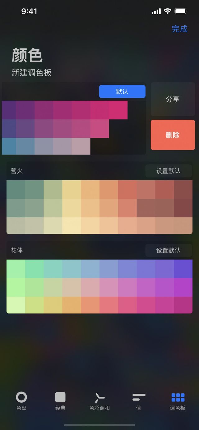 在调色板库中用单指在你选定调色板上向左轻滑,即会看到 删除 指令按钮。