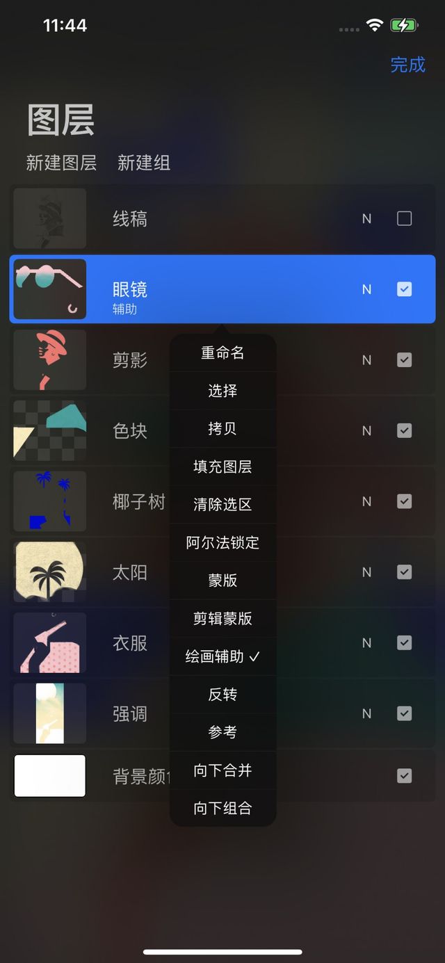 在图层列表中轻点图层后呼唤 图层选项,再轻点 辅助绘图 按钮。