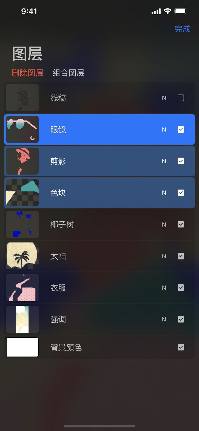 单指右滑即可选定次要图层组,这个操作会应用在该组中的每一个图层上。