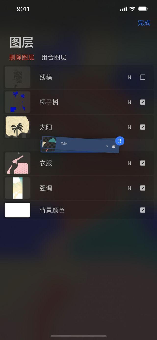 轻点并长按一个图层或图层组即可拖动,移动上下排序后,放开手指就会将图层放置在新序列中。