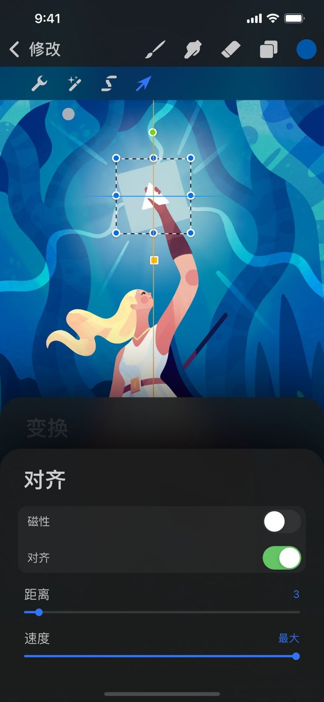轻点 修改 > 变换 > 设置 > 对齐 按钮并将 对齐 开关打开就能启用;若想关闭功能,轻点以关闭 对齐 开关即可。