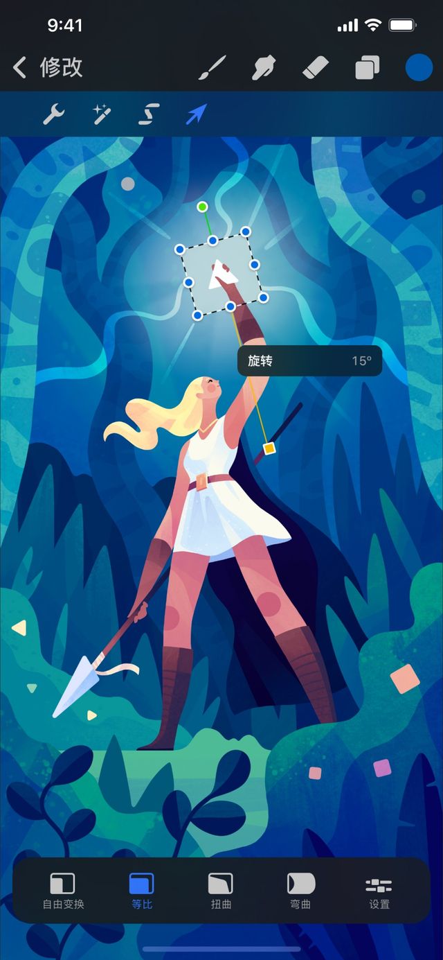 通过 iOS 的数字键盘键入精准数值的高度、宽度和角度,以进行准确的 自由变换变形、等比变换 和旋转 操作。