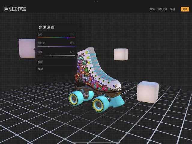 接着你就能对现有灯光进行编辑、增添至最多 4 个光源,或从 11 个不同环境光中选择一个舞台让你耀眼展现你的 3D 作品。