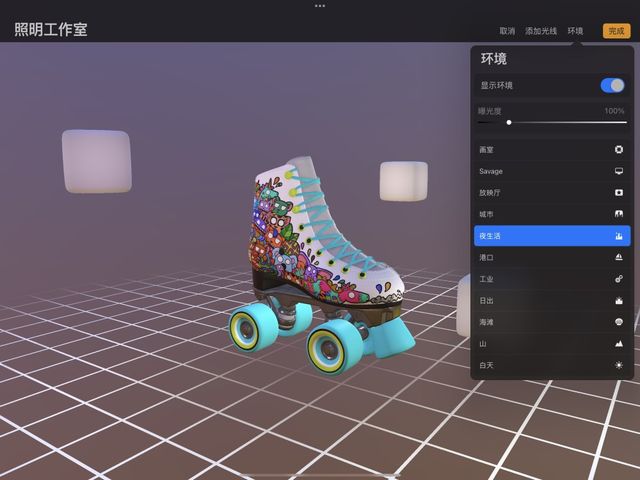 轻点 环境 打开环境面板,并使用不同环境光作为你 3D 绘图时的场景。你能找到 11 个自带的不同室内外环境,还能掌控环境的曝光度或完全移除背景。