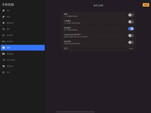 若启用 自动全屏,一旦你开始绘图即会以全屏界面显示,当你提起在画布上的任何触碰,在短暂延迟后会自动回到一般界面。向左拖动滑键缩短延迟时间、或向右拖动来增长延迟。