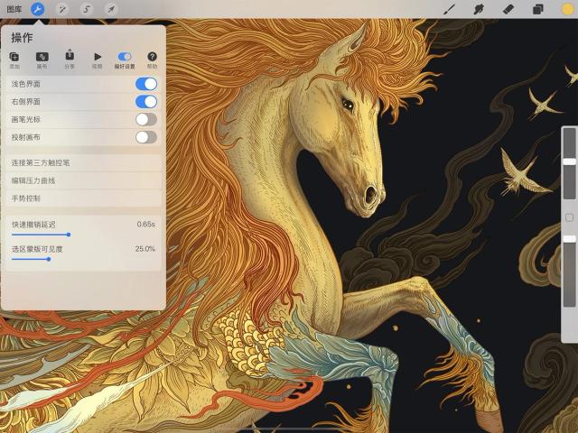 至 操作 > 偏好设置,透过一系列简洁易懂的选项开关改变 Procreate 的界面外观和操作习惯。