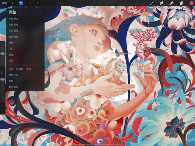 调整菜单的上半部为 滤镜 :专为瞬间创造有趣又抢眼的视觉效果所设计的便利工具。继续阅读浏览大纲,或透过 Procreate 使用手册 的各个页面深入探索各个工具。