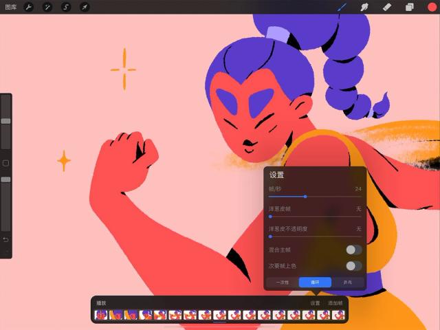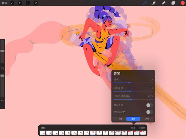 在传统手绘动画制作中,动画师会将一叠画作一同放置在在灯箱上,灯光会穿透这叠薄纸张、将所有画面反映在最上面的当前画面中,这能帮助动画师为下一帧准备最为流畅、写实的动态描绘;由于动画纸张薄如洋葱皮,这个制作方式称作“洋葱皮”。Procreate 的洋葱皮功能让你能照样在当前帧周边看到一层朦胧的动画预览。