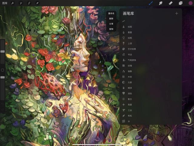 编辑、管理、分享并探索 Procreate 自带的丰富缤纷笔刷世界。