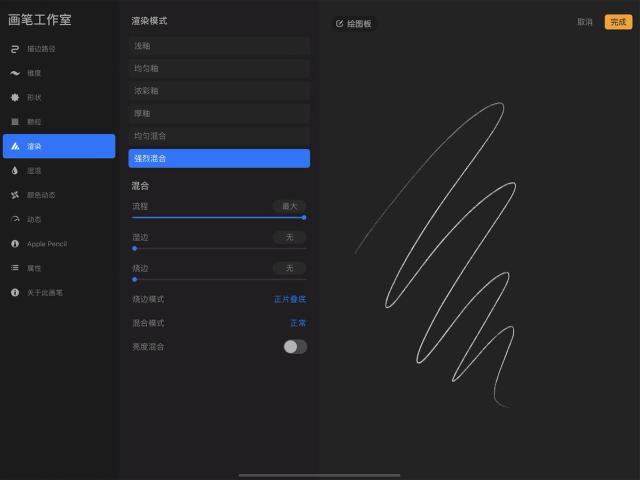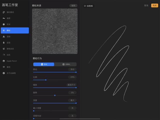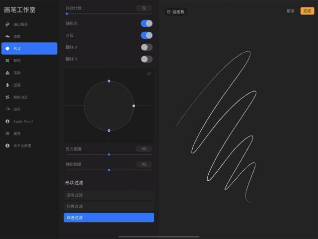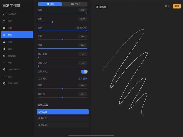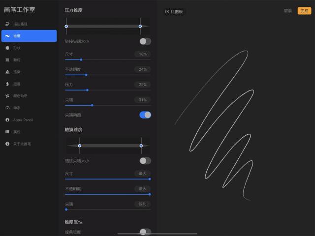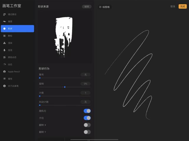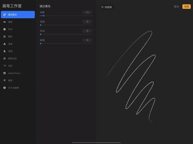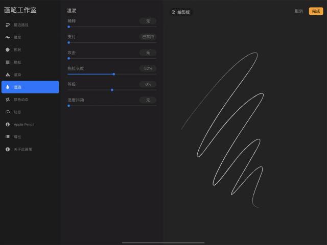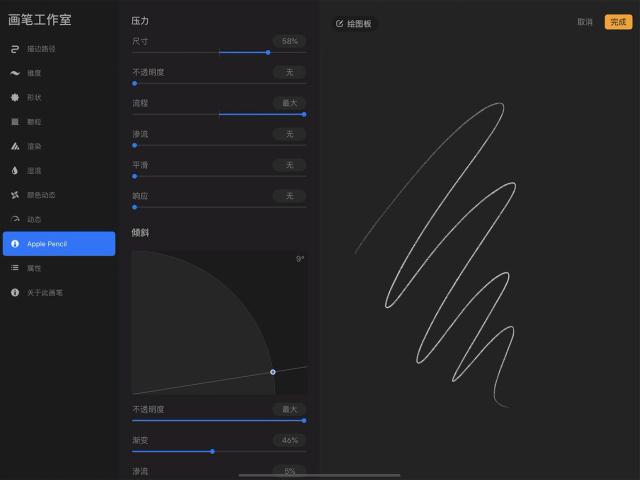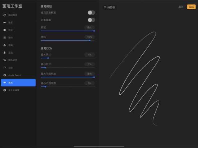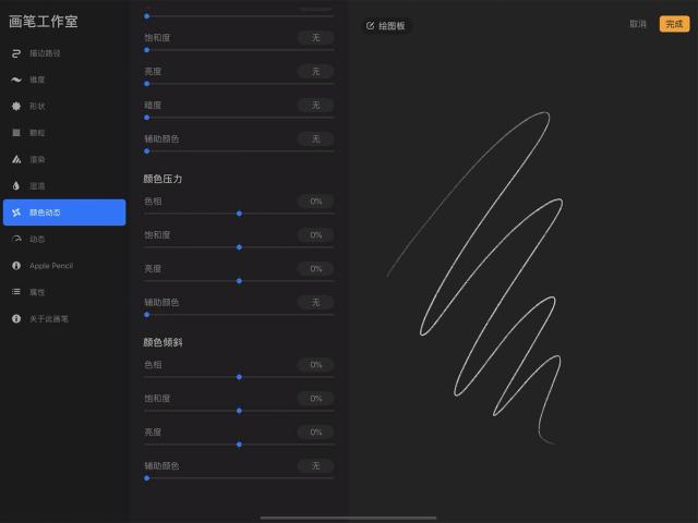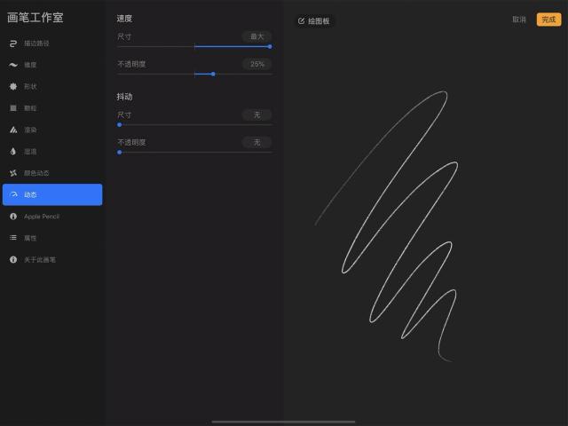 这些设置并不依赖 Apple Pencil 的压感和倾斜度,因此对于用手指作画而想创造更为多元的笔划时相当实用。