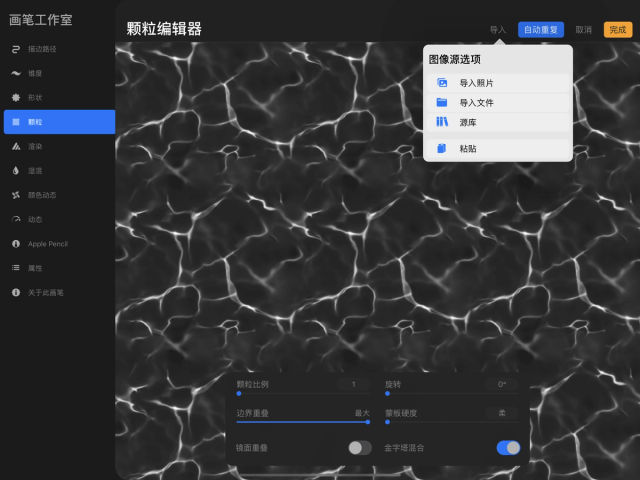 点击“颗粒来源”颗粒预览图右上方的 编辑 按钮进入“颗粒编辑器”,让你自由导入并编辑图像,并将图像变成你画笔中的无缝颗粒纹路。至下方阅读更多信息。