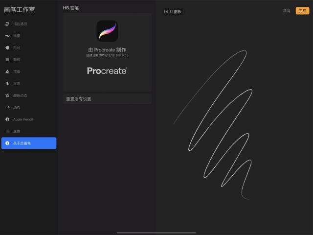 若是使用核心默认画笔,“重置”将会移除你的所有变动并将其复原为 Procreate 的软件原始笔刷版本;若你想为它设置新的重置点,你必须使用默认画笔的复制版本。不过你能随时为你自己创建的原创笔刷更改重置点。