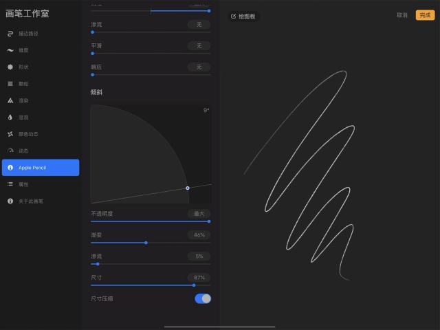 调节 Apple Pencil 倾斜时的反应表现。这些 Apple Pencil 的倾斜设定会对所有与倾斜度相关的设置产生滴漏效应。
