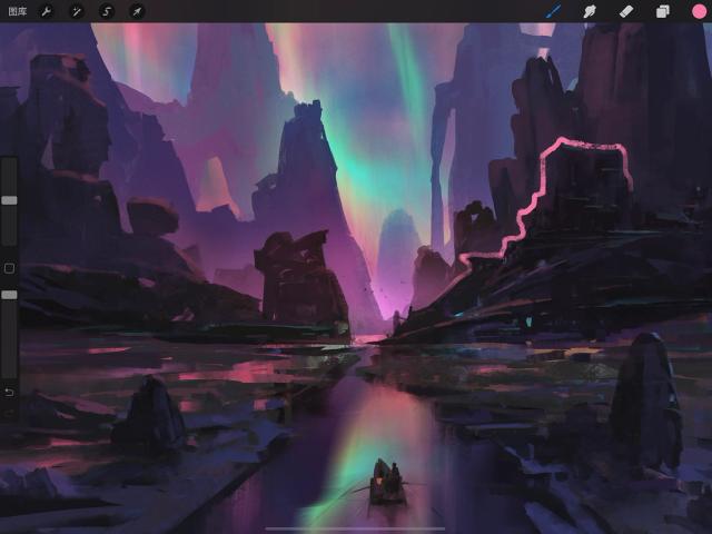你也可以使用 Apple Pencil 来创作;你使用 Apple Pencil 时的压力度和倾斜度会影响你的笔划效果,从暗度、粗细度、不透明度、散布,甚至你创造的色彩都会改变,如同使用真实的铅笔或笔刷一样。