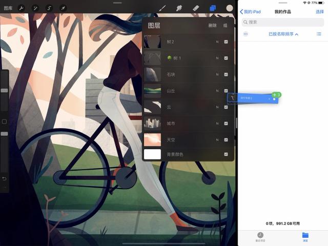 拾起一个图层并拖动至任一相容存储位置即能将它以图像导出,你可以导出至其他 Procreate 文件中、其他应用及任一苹果功效位置例如 iCloud 云端 或 文件应用 的文件夹。