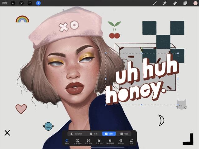 你也可以在 自由变换 模式中扭曲变形物件:点击并长按一个角落节点,你就会在屏幕上方呼唤出 扭曲 模式,该模式只在你手指长按的状况下持续启用,一旦手指放开后即会回到 自由变换 模式。