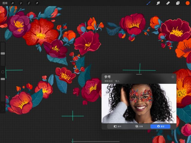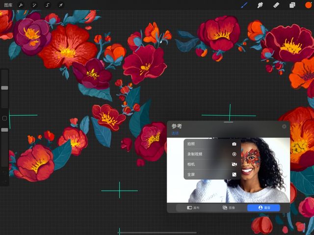 若想手动启用 面容彩绘 助手,轻点 操作 > 画布 > 参考 开关开启 参考助手 后,再轻点 参考助手 窗口中的 面容 按钮即能启用面容彩绘。此时你将会在 参考助手 窗口中看到 iPad 前置摄像头捕捉到的实时摄像。