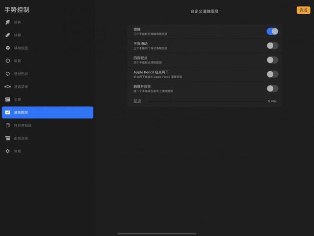 清除图层的默认快捷为 擦触,该快捷手势无法用来呼唤任何其他功能。