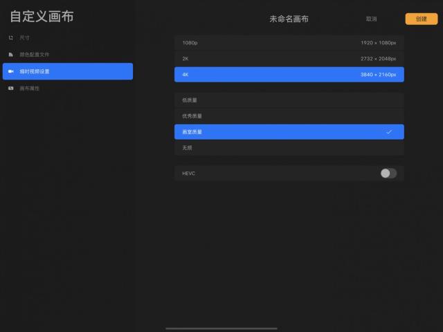 在此你能够为你的新画布变更缩时视频设置,替视频选择 1080p 至 4K 分辨率,并选用 低质量(文件尺寸较小、便于分享)或 无损(无失真的完美质量但文件尺寸较大)等质量录制。