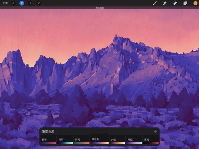 渐变色库自带八种预设渐变,可以瞬间应用在你的作品上——神秘、微风、瞬间、威尼斯、火焰、霓虹灯、黑暗、摩卡;轻点任一渐变色板即在图像上应用。 你也可以在色库里向左、右滑动手指,让各种渐变调色滤镜在你的画布上如跑马灯般实时应用呈现。