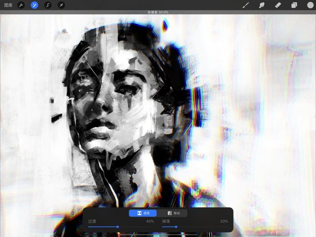 想要从视觉上理解色像差滤镜中的 过渡 和 掉落 效果,你可以滑动手指将色像差滤镜调至 100% 后,再来回滑动 过渡 和 掉落 的调节钮以预览。