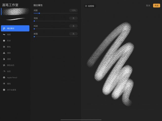你的新混制笔刷会以组合的主要画笔命名;想重新命名则轻点进入 画笔工作室,接着轻点 关于此画笔 的画笔名称来呼唤 iOS 键盘修改。