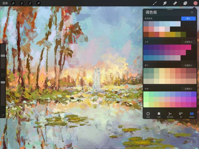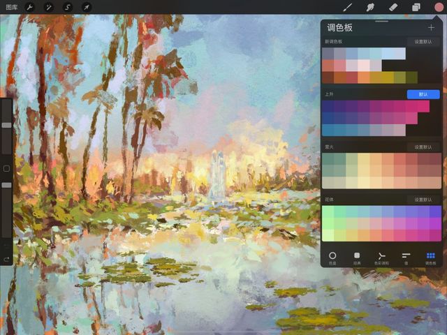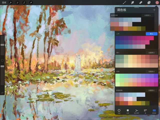 色彩面板底部显示默认调色板,轻点其空白色卡处就能够将当前颜色保存成调色板色卡。
