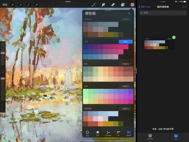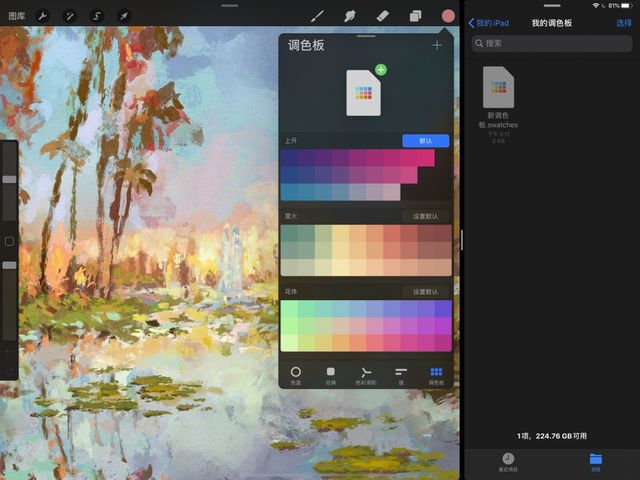 打开 色彩面板 并轻点 调色板 按钮以显示你的所有调色板。轻点调色板界面右上角的 + 图标并选择 从“文件”新增。