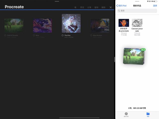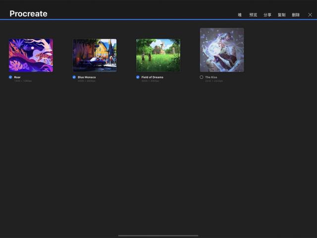 迅速地从 Procreate 中拖曳多件作品并丢放导出至其他应用中。