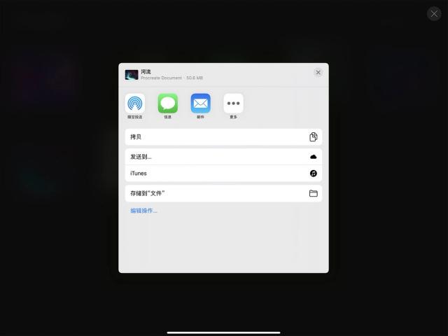 Procreate 采用 iOS 共享系统,所以你可以直接隔空投送、隔空打印或分享至任何有提供文件扩展名的应用程序或服务。
