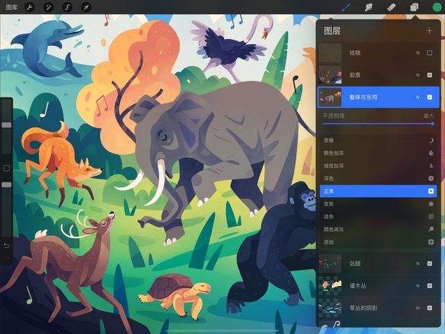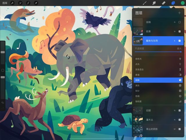 轻点模式名称即能看到可滑动的混合模式清单,在你滑动的同时,经过的混合模式会直接显示在画布上供你预览效果。