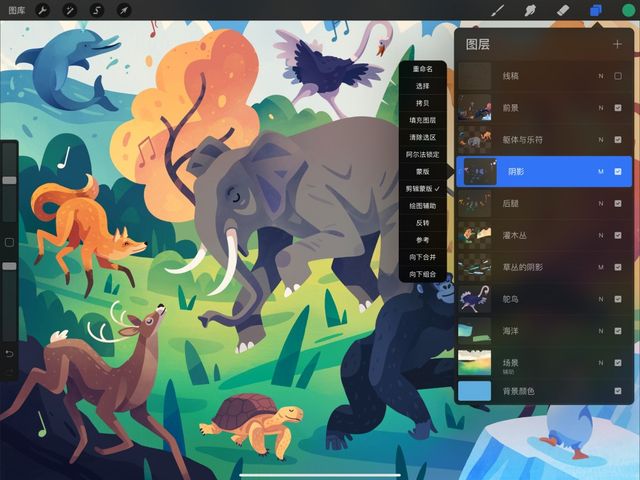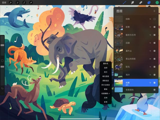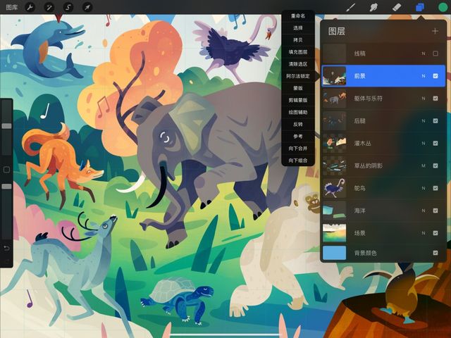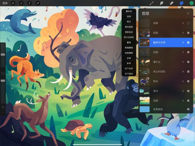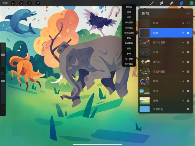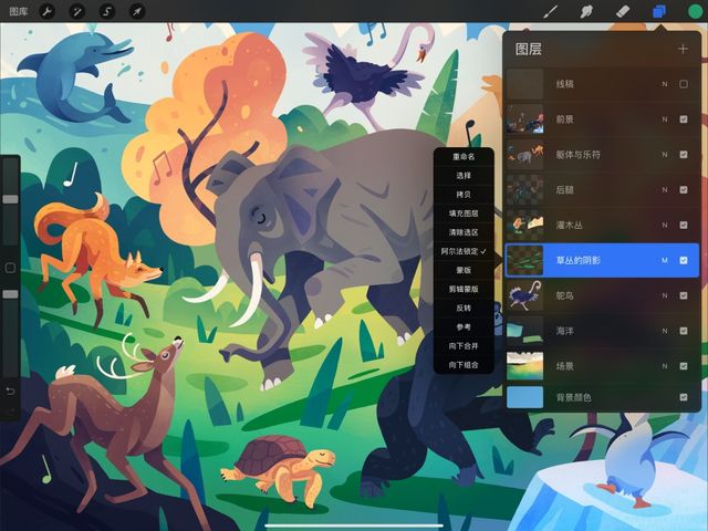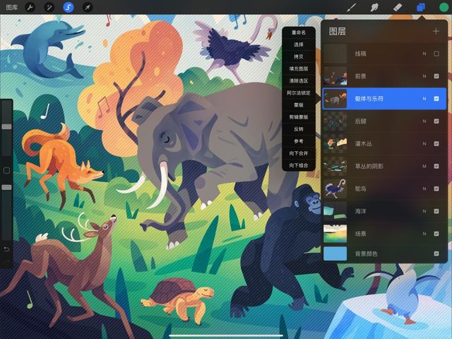 在图层选项菜单中找到重命名、选择、拷贝、填充图层、清除选取,或上手使用强大的阿尔法锁定、蒙版、参考、合并等工具。