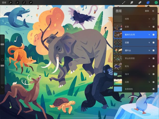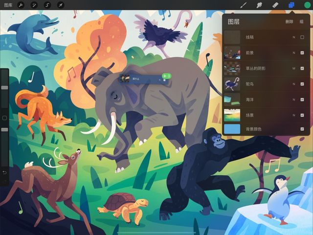 轻点并选定主要图层组,此时你将可以进行所有 选取 及 变换,“操作”菜单中的所有行动则会一次反映在该图层组的所有图层上;但你无法使用绘画、涂抹、橡皮或调整工具。