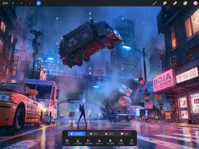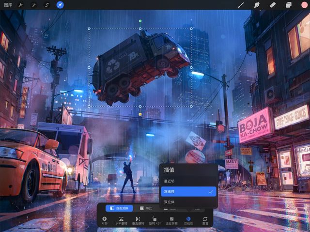 想象你要放大位于一个网格中的单个像素红点,而对该像素进行变形时,想在同样尺寸的网格中将红点放大,这个红点就必须使用到网格中更多的空间,原本的一个像素即会变成使用两个、三个、四个、甚至更多个像素——而 Procreate 得运算出这些像素的位置和模样。简而言之,软件基于你的图像模样,在图像放大并占用空间时猜测要在哪儿填入多出的像素。