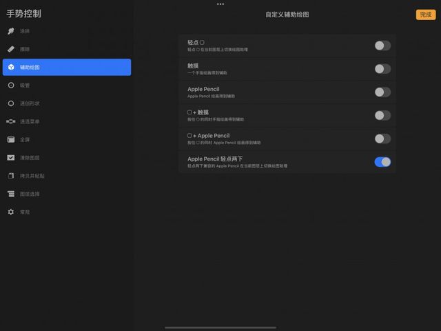 这个可自定义的快捷让你用指尖切换你最喜欢的功能,在 iOS 设置 面板中的 Apple Pencil 部分变更默认快捷,或在 Procreate 的 手势控制 面板中变更选项。