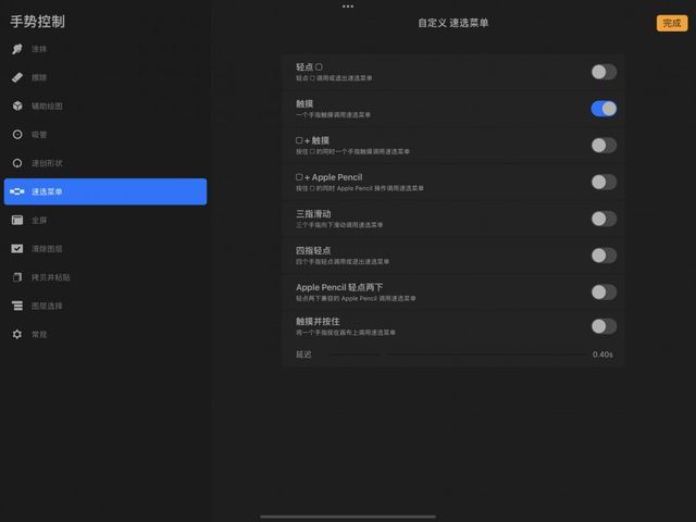 若你习惯使用 Apple Pencil 绘图而不使用手指绘图,你可以将一指单点设为呼唤速选菜单的快捷,让你用一个好记又便捷的方式呼唤所有你最常用的工具,帮助你工作速度加倍。