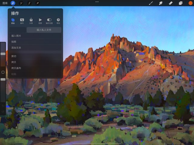 想从你的 照片 应用将 JPEG、PNG 或 PSD 图像插入至你的画布上,先轻点 操作 > 添加,接着在 插入照片 按钮上向左滑动直到名为 插入私人照片 的灰色按钮出现。轻点该按钮将自动呼唤你的 照片 应用,即可在相簿中滑动找到你先前拍摄或保存至 iPad 的照片。