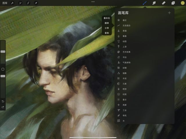 在一支笔刷缩略图上向左滑并点击 分享 即可分享单支笔刷,Procreate 会将你的画笔创建为 .brush 文件让你自由分享。