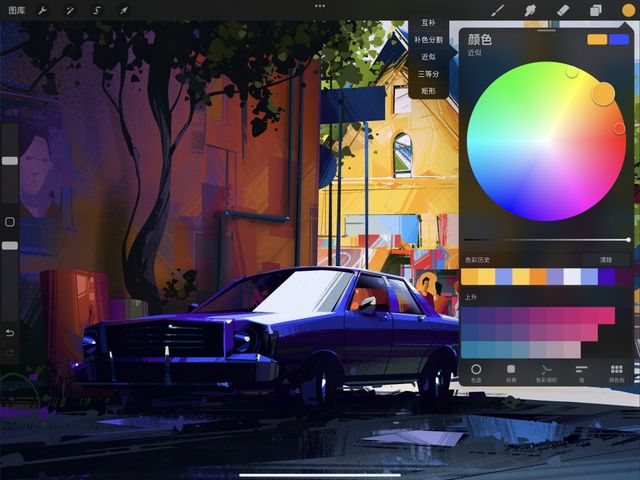 用色彩理论为你的创作增添缤纷绚丽。“色彩调和”依你的选色迅速提供你互补色、补色分割、近似色、三等分及矩形配色。