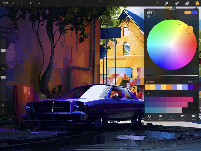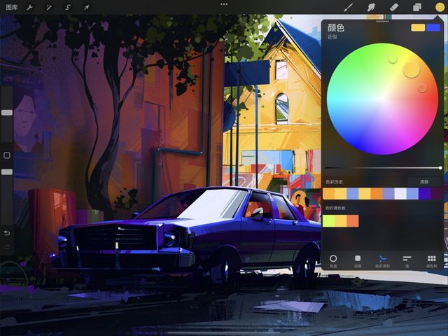 轻点任一标圈来选取颜色,自此你即能用该颜色创作;你也可以轻点色彩调和提供的颜色,并丢放至调色板中创造你的个人配色。
