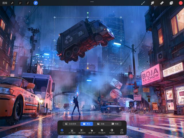 想象你要放大位于一个网格中的单个像素红点,而对该像素进行变形时,想在同样尺寸的网格中将红点放大,这个红点就必须使用到网格中更多的空间,原本的一个像素即会变成使用两个、三个、四个、甚至更多个像素——而 Procreate 得运算出这些像素的位置和模样。简而言之,软件基于你的图像模样,在图像放大并占用空间时猜测要在哪儿填入多出的像素。