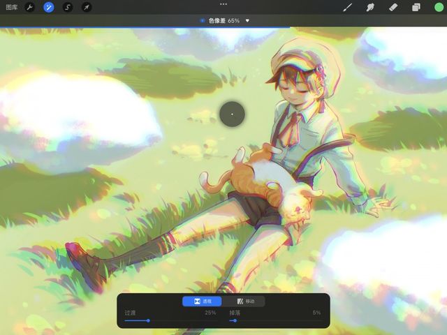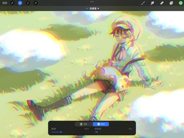 改变 RGB 图像中的红色和蓝色通道,仿造相机镜头中的色像差特效。摄影技术中的色像差效果较细微,看起来像蓝色或红色的色晕;在 Procreate 中你能掌控色像差的方向和偏离度,让你大肆创造抢眼的色像差特效。