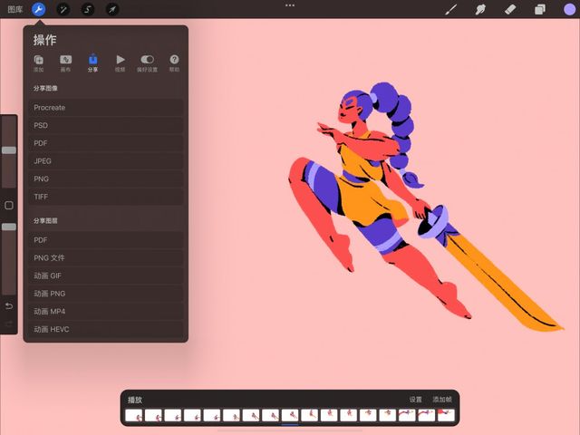 分享 菜单中的 分享图层 区块下,你能看到适合导出动画的三种格式,每种格式皆用不同方法将你的图层导出;只有设为可见的图层会被导出。
