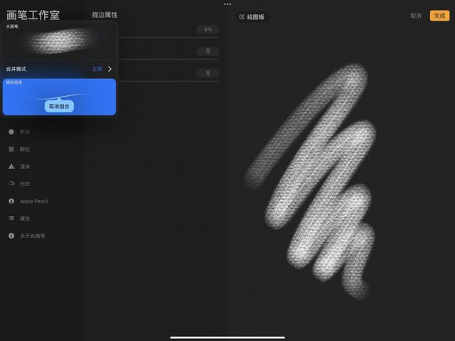 轻点第一支画笔作为当前主要笔刷(该画笔会以蓝色高亮标示),再右滑选定次要画笔(该笔刷会以深蓝色标示);此时 画笔库 右上方会出现 组合 字样,轻点就能将它们组合成一支包含两款笔刷特色的新画笔。