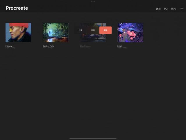 在作品缩图上向左滑动会呼唤 分享、复制 及 删除 该画布的选项。