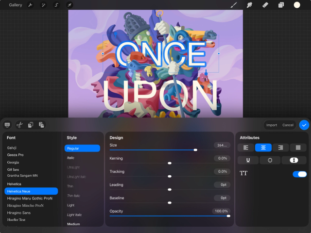 探索一系列 Procreate 默认字体和 iOS 系统字体,或轻松导入、拖曳丢放你自己喜爱的字体一同玩转。