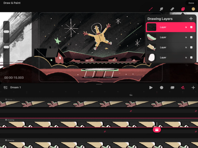 Any changes you make on the Stage will affect your currently selected layer. Procreate Dreams identifies your current selected layer by highlighting it. Tap a layer to select it. To select multiple layers, swipe right on each one. Delete and Group options will then appear.