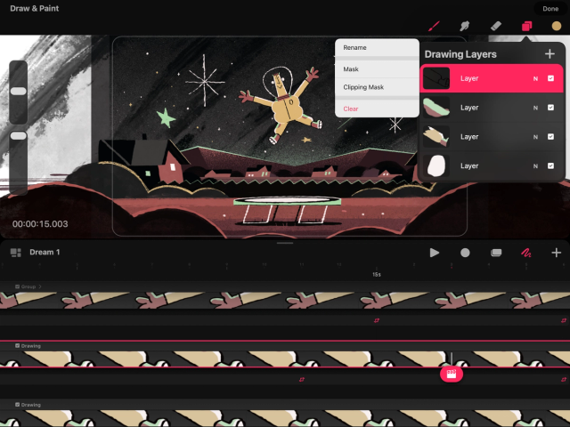 Use the layer options context menu to access options such as rename and clear. Tap on a selected layer to open layer options.