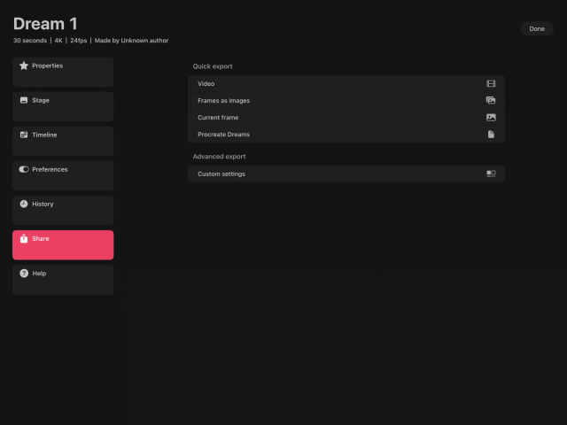 Procreate Dreams files exported from Share do not contain any history. This may reduce the size of the exported file, ideal for sharing with other users.
